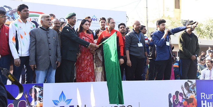 जयपुर। सुबह-सुबह सर्दी के बीच आर्मी जवान, बच्चों और बुजुर्ग ने उत्साह के साथ दौड़ लगाकर लोगों को मानवता के प्रति और साफ सफाई के प्रति जागरूक किया। विभिन्न स्कूलों के बच्चों सहित करीब 4000 लोगों ने दौड़ लगाकर एकजुट होने का संदेश भी दिया। मौका था सक्षम संस्थान व मैसेज आर्गेनाइजेशन के संयुक्त तत्वावधान में आयोजित ह्यूमैनिटी मैराथन का। मैराथन में सभी का उत्साह देखते ही बन रहा था। सुबह साढ़े 9 बजे मानसरोवर के टेक्नोलॉजी पार्क से शुरू हुई मैराथन बी-2 बाईपास स्थित द्वारकादास गार्डन चौराहे पर पहुंचकर संपन्न हुई। मैराथन का शुभारंभ विधायक दीयाकुमारी ने हरी झंडी दिखा कर किया। कार्यक्रम में विशेष अतिथि सांसद रामचरण बोहरा, मेयर अशोक लाहोटी, स्पेशल कमांडर जयपुर ब्रिगेडियर अजीत सिंह, स्टाफ ऑफिसर मेजर राहुल मिश्रा सहित चार ऑफिसरों एवं भाजपा के संजय जैन ने सेना के जवानों और युवाओं का हौसला बढ़ाया। इस दौरान मंच पर मौजूद इंडियाज वेस्ट ड्रामेबाज अवॉर्डेड आठ वर्षीय यश राजस्थानी की प्रस्तुति आकर्षण का केंद्र रही।