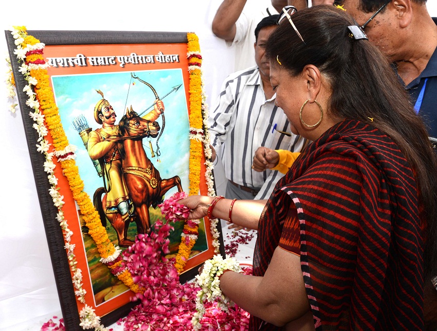 इससे पहले मुख्यमंत्री राजे ने पुलिस लाइन में हैलीपेड पर सम्राट पृथ्वीराज चैहान की जयंती के अवसर पर उनके चित्र पर पुष्पांजलि अर्पित की। इस अवसर पर सांवराराम महाराज, महिला एवं बाल विकास राज्यमंत्री अनिता भदेल, संसदीय सचिव सुरेश सिंह रावत, शत्रुध्न गौतम, राजस्थान धरोहर संरक्षण एवं प्रोन्नति प्राधिकरण के अध्यक्ष ओंकार सिंह लखावत, अजमेर विकास प्राधिकरण के अध्यक्ष शिवशंकर हेड़ा, अजमेर महापौर धर्मेन्द्र गहलोत, जिला प्रमुख वन्दना नोगिया, विधायक भागीरथ चौधरी, शंकर सिंह रावत सहित अन्य जनप्रतिनिधि, अधिकारी एवं आमजन मौजूद थे।
