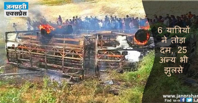 हमीरपुर। यूपी के बांदा में शनिवार को एक दर्दनाक हादसा सामने आया। जब यात्रियों से भरी एक रोडवेज बस अनियंत्रित होकर विद्युत पोल से जा टकराई। विद्युत पोल टूटने से हाईटेंशन लाइन का तार सीधे बस पर जा गिरा। जिससे बस में सवार 6 लोगों की मौत हो गई। वहीं 25 अन्य जख्मी हो गए। हादसा बांदा से 55 किलोमीटर दूर जसपुरा रोड पर हुआ। हमीरपुर डिपो की बस सुबह बांदा के लिए निकली थी। रास्ते में जसपुरा रोड पर बस का स्टेयरिंग फेल हो गया। जिससे बस अनियंत्रित होकर विद्युत पोल से टकरा गई। बस के टकराने के साथ ही हाईटेंशन लाइन का तार बस पर गिरा तो लोग करंट से बुरी तरह झुलस गए। तीन की पहचान ही नहीं हो सकी। हादसे के दौरान सुरक्षित रहे एक पैसेंजर उमर खान ने बताया कि बस में कुल 30 लोग मौजूद थे। मैं एक वैवाहिक आयोजन में शामिल होकर उरई लौट रहा था। चालक बस को तेज रफ्तार में भगा रहा था। तभी बस का स्टेयरिंग फेल हो गया। बस विद्युत पोल से टकराई तो तार टूटकर उस पर गिर पड़ा। करंट से झटकों से लोगों में हाहाकार मच गया। लोग करंट के झटकों से झटपटा उठे। बाद में पोल से टकराने के 10 मिनट बाद बस में आग लग गई। तब तक 10 सवारियां बाहर निकल चुकी थी। लेकिन 25 अन्य सवारियां करंट से झुलस गई। जिन्हें सरकारी अस्पताल में भर्ती कराया गया। हादसे के बाद बस चालक व परिचालक मौके से भाग निकले।