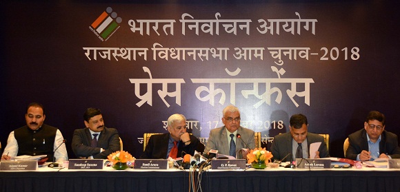 जयपुर। मुख्य चुनाव आयुक्त ओपी रावत, चुनाव आयुक्त सुनील अरोड़ा, अशोक लवासा ने भारत निर्वाचन आयोग के वरिष्ठ अधिकारियों ने शनिवार को एसएमएस कन्वेंशन सेंटर में राजस्थान विधानसभा आम चुनाव-2018 की तैयारियों का जायजा लिया। आयोग द्वारा मुख्य सचिव, पुलिस महानिदेशक, जयपुर, भरतपुर, अजमेर और बीकानेर संभाग के संभागीय आयुक्त, पुलिस महानिरीक्षक, जिला निर्वाचन अधिकारी, जिला पुलिस अधीक्षक सहित विभिन्न विभागों के नोडल अधिकारियों के साथ विस्तृत विचार-विमर्श कर दिशा-निर्देश दिए।