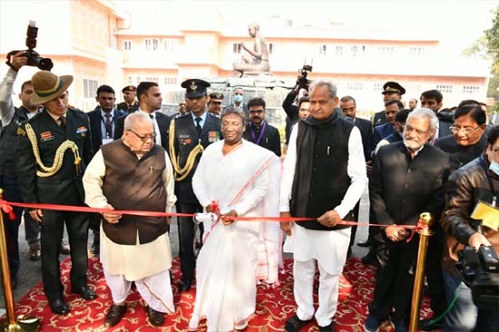 मुख्यमंत्री अशोक गहलोत ने अपने संबोधन में राष्ट्रपति द्रौपदी मुर्मु का स्वागत करते हुए कहा कि हमारे संविधान के निर्माण के साथ ही देश में महिलाओं सहित सभी नागरिकों को बराबरी के अधिकार दिए गए। यह भारत रत्न बाबा साहेब डॉ. भीमराव अम्बेडकर और संविधान सभा के सदस्यों की पवित्र सोच को दर्शाता है। मुख्यमंत्री ने कहा कि संविधान की मूल भावना हर नागरिक को पता होनी चाहिए। उन्होंने कहा की इसे ध्यान में रखते हुए ही राज्यपाल कलराज मिश्र संवैधानिक जागरूकता के लिए बहुत प्रतिबद्धता के साथ कार्य कर रहे हैं। उन्होंने विश्वास व्यक्त किया कि राजभवन में नवनिर्मित संविधान पार्क संवधानिक आदर्शों, मूल्यों और इसकी मूल भावना के प्रसार को आगे बढ़ाएगा। प्रारम्भ में राष्ट्रपति मुर्मु ने शिला पट्टिका का अनावरण कर संविधान उद्यान का लोकार्पण किया। इसके उपरान्त उन्होंने राज्यपाल कलराज मिश्र, मुख्यमंत्री अशोक गहलोत, विधानसभा अध्यक्ष डॉ. सी.पी. जोशी एवं नगरीय विकास एवं आवासन मंत्री शांति धारीवाल के साथ संविधान उद्यान का भ्रमण किया। उन्होंने विभिन्न मूर्तियों, छायाचित्रों, मॉडल आदि में संजोई गई भारतीय संविधान के निर्माण की ऐतिहासिक यात्रा का अवलोकन किया। उन्होंने राजभवन में स्थापित फ्लैग पोस्ट, मयूर स्तम्भ, गांधी प्रतिमा एवं महाराणा प्रताप प्रतिमा की सराहना की। उन्होंने संविधान उद्यान के कलात्मक एवं विशद प्रस्तुतीकरण और वृहद शिल्प को महत्वपूर्ण बताते कहा कि इससे यहां आने वाले लोग संविधान की संस्कृति से जुड़ेंगे। राज्यपाल के प्रमुख सचिव सुबीर कुमार, प्रमुख विशेषाधिकारी गोविन्दराम जायसवाल एवं आर्किटेक्ट अनूप बरतरिया भी इस दौरान साथ रहे। राज्यपाल ने राष्ट्रपति मुर्मु को इस अवसर पर संविधान उद्यान पर प्रकाशित पुस्तक और स्मृति चिन्ह भेंट किया। कार्यक्रम में संविधान उद्यान पर आधारित चलचित्र का भी प्रदर्शन किया गया। राष्ट्रपति ने इस अवसर पर पावर ग्रिड कारपोरेशन ऑफ इंडिया द्वारा राजस्थान में सौर ऊर्जा क्षेत्रों के लिए स्थापित पारेषण तंत्र का वर्चुअल उद्घाटन भी किया। उन्होंने एक हजार मेगावाट की बीकानेर सौर विद्युत परियोजना का वर्चुअल शिलान्यास भी किया। कार्यक्रम में मुख्य न्यायाधीश पंकज मित्थल, राज्य मंत्रीपरिषद के सदस्यगण, नेता प्रतिपक्ष गुलाब चन्द कटारिया, सांसदगण, विधायकगण, मुख्य सचिव उषा शर्मा एवं बड़ी संख्या में जनप्रतिनिधिगण, गणमान्यजन और प्रशासनिक अधिकारीगण उपस्थित रहे।