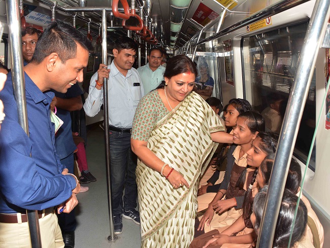 जयपुर। देश की प्रथम महिला प्रधानमंत्री इंदिरा गांधी की जयन्ती के अवसर पर मंगलवार को 350 से भी अधिक छात्राओं ने मेट्रो में निःशुल्क सफर का आनन्द लिया। जयपुर की विभिन्न राजकीय स्कूलों से आईं इन छात्राओं ने ना केवल मेट्रो यात्रा को अपनी सुखद स्मृतियों में समेटा, बल्कि मैट्रो की कार्यप्रणाली के बारे में भी जानकारी ली।