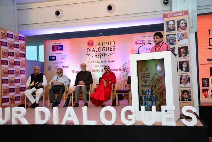 जयपुर। जयपुर डायलॉग्स फोरम की ओर से तीन दिवसीय जयपुर डायलॉग्स कार्यक्रम रविवार से यहां वल्र्ड ट्रेड पार्क में शुरु हुआ। कार्यक्रम में भारत की एकता व विभाजन के तत्व विषयक प्रथम सत्र में डेविड फ्राले आयुर्वेद ज्योतिष व योग में वैदिक विद्वान और विशेषज्ञ, सोनल मानसिंह सांस्कृतिक विदूषी व पद्म विभूषण, नरेन्द्र कोहली महासमर के लेखक, आरिफ मोहम्मद खान पूर्व केन्द्रीय मंत्री व इस्लामिक विद्वान, वरिष्ठ पत्रकार शेखर गुप्ता, आलोक मेहता, संजय दीक्षित आईएएस आदि ने अपने विचार रखें। पूर्व केन्द्रीय मंत्री आरिफ मोहम्मद खान ने धर्म पर चर्चा करते हुए कहा, कि धर्म परोपकार है यानि दूसरों पर उपकार करना ही धर्म है। जैसा कि गोस्वामी तुलसीदास ने कहा ह, जाकी राही भावना जेसी प्रभु देखी तिन मूर्त तेसीष, यानि धर्म कहता हे किसी को दर्द मत दो, किसी को बाटो मत।