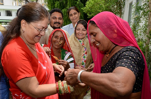 इन महिलाओं ने राजे को चुनरी ओढ़ाकर राखी बांधी और चूड़ी पहनाई। मुख्यमंत्री ने दोनों महिलाओं से सहृदयता पूर्वक बातचीत की और उनका धन्यवाद ज्ञापित किया। स अवसर पर भाजपा प्रदेशाध्यक्ष अशोक परनामी, राष्ट्रीय सह संगठन महामंत्री वी. सतीश, गृहमंत्री गुलाबचंद कटारिया, जिलों के प्रभारी मंत्री तथा नगर निगमों के महापौर, उप-महापौर एवं भाजपा पार्षद उपस्थित थे।