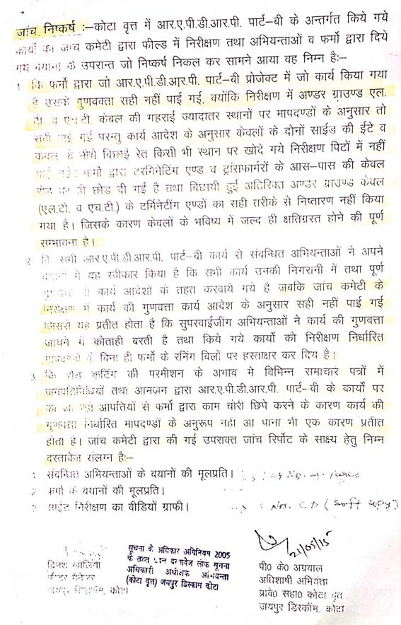 अंडर ग्राउण्ड केबल (एलटी एवं एचटी) के टर्मिनेटिंग एण्ड आरएमयू को डिस्ट्रीब्यूटर बॉक्स में कनेक्ट कर दिए गए, लेकिन इसके अलावा सारे टर्मिनेटिंग एवं बिना किसी कवरिंग के खुली अवस्था में छोड़ दिए गए। जबकि जेवीवीएनएल कोटा के कनिष्ठ अभियंता, सहायक अभियंता और अधिशाषी अभियंताओं द्वारा कार्यों का मापदण्डों के अनुसार निरीक्षण करना बताकर पूरा भुगतान कर दिया।