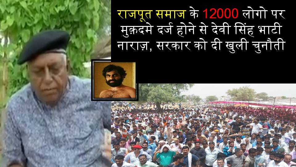 जिसमें उन्होंने प्रदेश की भाजपा सरकार को खुली चुनौती देते हुए कहा कि समाज के एक भी निर्दोष व्यक्ति पर आंच आई तो सड़कों पर उतरने को मजबूर होना पड़ेगा। शनिवार को जयपुर स्थित राजपूत समाज सभा भवन में घुसकर तलाशी लेने के मामले में एक इंटरव्यू के दौरान देवी सिंह भाटी ने कहा कि इस तरह की रणनीति से आप राजपूत समाज को छेड़ रहे हो। ऐसा नहीं कि आप मुंह में अंगूली घुमा रहे हो और हमारे दांत नहीं है। यह कतई नहीं चलेगा। सभा भवन में आकर तलाशी लेने का पुलिस का यह तरीका सही नहीं है। यह कमजोरी हम कभी नहीं आने देंगे, चाहे सड़कों पर उतरना पड़े।