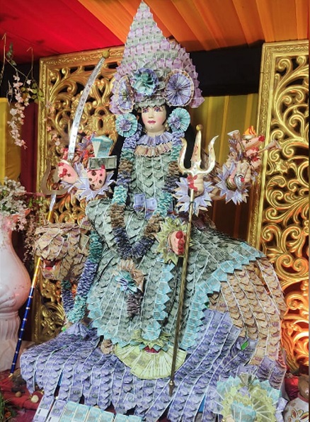 उदयपुर. उदयपुर इन दिनों नवरात्रि के बीच गरबा पांडाल से लेकर देव स्थानकों पर रोजाना नई थीम पर सजावट हो रही है। नोटबंदी और कोरोना के बाद एक बार फिर नोटों की सजावट का प्रचलन बढ़ा हैं। प्रतिमा को नोटों से शृंगारित किया जाने लगा हैं। रविवार को शहर में कई जगह नोटों से आकर्षक शृंगार धराया गया। भुवाणा के गवरी चौक में बालेश्वरी नवयुवक मंडल ने मातारानी और सेक्टर 14 में काली कल्याण शक्तिपीठ में लोकदेवता कल्लाजी बावजी को 11 लाख 11 हजार एक सौ 11 रुपए की आंगी धराई। इस दौरान आसपास के क्षेत्रों से बड़ी संख्या में श्रद्धालु दर्शन के लिए पहुंचे। बालेश्वरी नवयुवक मंडल के गणेश लाल ने बताया कि पिछले कई सालों से गवरी चौक में ऐतिहासिक गरबा का आयोजन किया जा रहा है। कमेटी के सर्व निर्णय से इस बार मातारानी को 11 लाख रुपए की आंगी धराई गई। दरअसल आंगी में आम तौर पर नए नोटों का उपयोग किया जाता है। कई दिनों तक बैंक में चक्कर काटने के बाद कार्यकर्ताओं को नए चमचमाते नोट मिल पाए। नोटों से मोम से चिपका कर आंगी बनाई गई। इसमें माता रानी का मुकुट और माला बनाने में सर्वाधिक मेहनत लगी। आंगी में 10 रुपए के नोट से लेकर 2000 रुपए तक के नोट उपयोग में लिया लिए, ताकि अलग-अलग कलर से आंगी का आकर्षक और अधिक झलके। वहीं सेक्टर 14 स्थित काली कल्याणी धाम कल्लाजी बावजी स्थानक पर भी 11 लाख 11 हजार एक सौ 11 रुपए की आंगी धराई गई। पुजारी हेमंत जोशी ने बताया कि नवरात्रि पर्व पर सप्तमी पूजन यह आंगी बावजी को धराई गई। ढोल-नगाड़ों की थाप पर आरती हुई। 101 कन्याओं के पूजा के बाद सोमवार को भजन संध्या का भी आयोजन होगा।