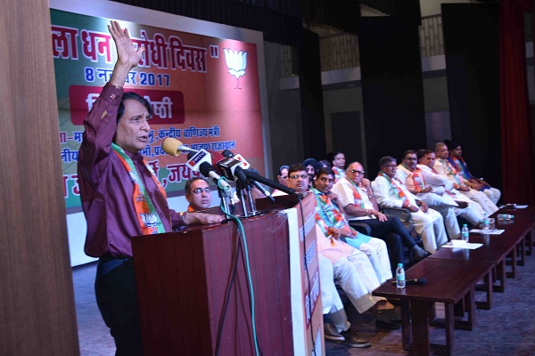 जयपुर। भारतीय जनता पार्टी ने आज पूरे देश मे नेरन्द्र मोदी जी के नेतृत्व वाली केन्द्र सरकार द्वारा गत 8 नवम्बर 2016 को भष्ट्राचार पर अंकुश लगाने व आतंकवाद को जड़ से समाप्त करने के लिए काला धन रखने वालो पर जोरदार प्रहार करते हुए नोटबंदी के ऐतिहासिक फेसले का एक साल पुरा होने पर काला धन के खिलाफ लड़ाई जारी रखने हेतु आज कालाधन विरोधी दिवस बनाया। जयपुर शहर भाजपा द्वारा ह्यह्यकाला धन विरोधी दिवसह्यह्य पर आज एक गोष्ठी का आयोजन किया गया जिसका उद्देश्य नोटबंदी से देश को क्या उपलब्धी हासिल हुई। शहर भाजपा के महामंत्री नरेश शर्मा ने बताया कि आज की गोष्ठी के मुख्य वक्ता केन्द्रीय वाणिज्य मंत्री श्री सुरेश प्रभु थे। सुरेश प्रभु ने गोष्ठी को सम्बोधित करते हुए कहा कि देश की जनता देश मे काग्रेस के भष्ट्राचार युक्त राज से त्रस्त हो चुकी थी। कांग्रेस राज मे भष्ट्राचार ने देश को खोखला कर के रख दिया था। ऐसे मे देश की जनता देशहित के लिए कांग्रेस से पिछा छुड़वा कर भाजपा के नेता नरेन्द्र जी मोदी को देश का प्रधानमंत्री देखना चाहती थी और देश की जनता ने ईमानदार छवि और देश मे से भष्ट्राचार को समाप्त करने की प्रतिबद्धता के लिए मोदी जी को वोट दिया और केन्द्र मे भाजपा की सरकार बनाई। मोदी जी ने देश की जनता के विश्वास पर प्रधानमंत्री बनने के पहले दिन से ही भष्ट्राचार से लड़ने के लिए काला धन रूपी बुराई को जड़ से उखाड़ फैकने के योजना पर कार्य शुरू किया और आज से एक साल पूर्व 8 नवम्बर 2016 को नोटबंदी कर देश मे 86 प्रतिशत हाई वेल्यु के (500 और 1000 रूपए) के नोट्स को बंद किया जिससे भष्ट्राचार और कालेधन के खिलाफ सरकार की प्रतिबद्धता को और मजबुती मिली।