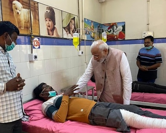 गांधीनगर. गुजरात में ब्रिज हादसे के दो दिन बाद मंगलवार को प्रधानमंत्री नरेंद्र मोदी मोरबी पहुंचे। यहां उन्होंने सिविल अस्पताल में घायलों से मिलकर उनका हाल जाना। इसके बाद वे अपनों को खोने वाले 26 परिवारों से भी एसपी ऑफिस में मिले। उन्होंने यहां अफसरों के साथ बैठक भी की। मोरबी आते ही पीएम ने सबसे पहले घटनास्थल पहुंचकर मच्छू नदी पर टूटे ब्रिज का मुआयना किया। मोरबी में 30 अक्टूबर की शाम हुए पुल हादसे में अब तक 135 शव बरामद हुए हैं। हादसे के तीसरे दिन मंगलवार को नेवी और टीमों ने एक बार फिर शवों की तलाश शुरू कर दी है। गुजरात में बुधवार को एक दिन का राजकीय शोक घोषित किया गया है।