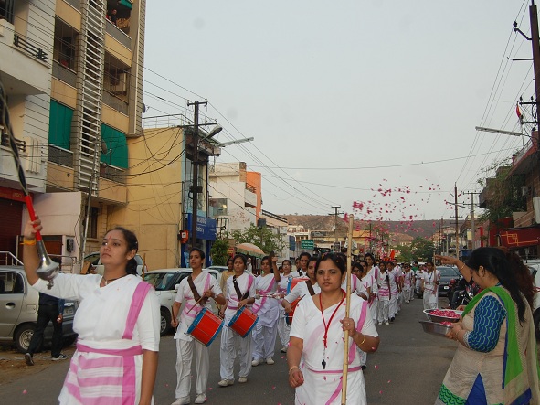 जयपुर। अनुशासन और शौर्य के साथ मातृ शक्ति आज शहर के मार्गो पर कदम से कदम मिलाते हुए पथ संचलन करते हुए निकली। अवसर था राष्ट्र सेविका समिति द्वारा प्रबोध शिक्षा वर्ग में आयोजित पथ संचलन का। 15 दिवसीय प्रबोध शिक्षा वर्ग जवाहर नगर स्थित आदर्श विद्या मन्दिर में चल रहा है। जिसमें आज सैकडों बहनों ने सेविका समिति के पूर्ण गणवेश में घोष के साथ पथ संचलन किया। पथ संचलन शाम 6 बजे रानी झांसी पार्क (माहेश्वरी पब्लिक स्कूल के सामने, जवाहर नगर) से प्रारम्भ होकर पंचवटी चौराहा, हनुमान ढाबा, मिल्की वेए माहेश्वरी पब्लिक स्कूल होते हुए रानी झांसी पार्क पर सम्पन्न हुआ। भारत माता की झांकी, घोष (बैण्ड) और ध्वज वाहिनी मुख्य आकर्षण का केन्द्र रही। मार्ग में अनेक स्थानों पर पुष्प वर्षा के द्वारा संचलन का स्वागत हुआ। वर्ग का समापन 2 जून को होगा।