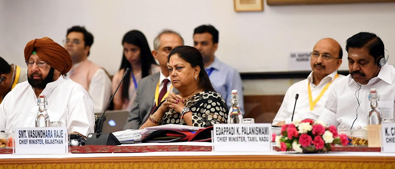 मुख्यमंत्री ने जल संरक्षण के क्षेत्र में राजस्थान के सांचोर में किए जा रहे प्रयासों को अपनी रिपोर्ट में स्थान देने के लिए नीति आयोग को धन्यवाद दिया। उन्होंने कहा कि एमजेएसए के उत्साहजनक परिणाम सामने आ रहे हैं। प्राथमिक रिपोर्टों के अनुसार भूजल स्तर में 1.3 मीटर तक की वृद्धि हुई है। रबी की फसल का रकबा 42 हजार हैक्टेयर बढ़ा है और हरित क्षेत्र में 300 हैक्टेयर की वृद्धि हुई है। इसके अलावा काफी संख्या में सूखे कुओं, बेकार हो चुके हैण्डपम्पों में पानी आने के साथ-साथ जलापूर्ति के लिए टैंकरों पर निर्भरता घटी है। राजे ने प्रधानमंत्री राष्ट्रीय स्वास्थ्य सुरक्षा मिशन का स्वागत करते हुए कहा कि हम केन्द्र की इस महत्वपूर्ण योजना के साथ भामाशाह स्वास्थ्य बीमा योजना को जोड़ने पर काम कर रहे हैं। भामाशाह स्वास्थ्य बीमा योजना में एक करोड़ एनएफएसए परिवारों को शामिल किया गया है और अब तक 20 लाख मरीज इसका लाभ उठा चुके हैं।