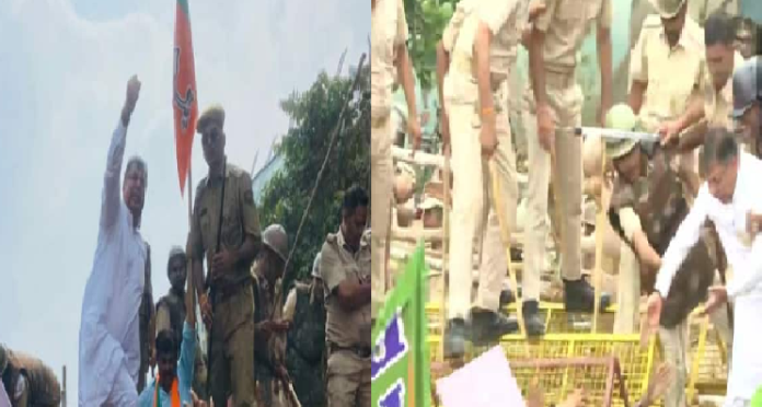 जयपुर. भारतीय जनता पार्टी की ओर से लंपी, बेरोजगारी और दूसरे मुद्दों को लेकर विधानसभा घेरने जा रहे पार्टी कार्यकर्ता पुलिस से भिड़ गए। जयपुर के सहकार मार्ग पर कार्यकर्ताओं ने पुलिस की बैरिकेडिंग भी तोड़ दी। इस बीच बैरिकेडिंग पर चढ़े बीजेपी प्रदेशाध्यक्ष सतीश पूनिया को पुलिसवालों ने धक्का मार दिया। जिससे वे नीचे गिर गए। वहीं प्रदर्शन के दौरान पूर्व मंत्री अरुण चतुर्वेदी का हाथ टूट गया। कार्यकर्ताओं को आगे बढ़ने से रोकने के लिए भारी संख्या में पुलिस बल तैनात किया गया था। इससे पहले सुबह 11 बजे सी-स्कीम स्थित बीजेपी ऑफिस से सैकड़ों की संख्या में पार्टी कार्यकर्ताओं ने पूनिया के नेतृत्व में भाजपा कार्यालय से विधानसभा घेराव के लिए कूच किया, लेकिन सहकार मार्ग पर पुलिस ने उन्हें रोक दिया। यहां पार्टी नेताओं की ओर से नेताओं व कार्यकर्ताओं ने सरकार के खिलाफ जमकर नारेबाजी की और गिरफ्तारी दी। वहीं, आज सुबह पार्टी कार्यालय पर सभा को संबोधित करते हुए सतीश पूनिया ने कहा अभी श्राद्ध पक्ष चल रहा है। 2023 में कांग्रेस पार्टी का परमानेंट श्राद्ध हो जाएगा। भारत और राजस्थान से कांग्रेस सरकार का सफाया हो जाएगा। उन्होंने कहा राहुल गांधी ने तेजाब फिल्म की माधुरी दीक्षित की तरह 123, 4567… गाना गाया था। किसानों के कर्ज माफ करने की घोषणा की थी, लेकिन आज तक कर्ज माफी नहीं हुई है। सैकड़ों किसान आत्महत्या कर चुके हैं। गहलोत सरकार गायों की हत्यारी है। बीजेपी मांग करती है कि जिन किसानों और पशुपालकों की गायों की मौत हुई है, उन सभी को 50-50 हज़ार रुपये का मुआवजा सरकार दे। राजस्थान सरकार के खिलाफ नारेबाजी करते कार्यकर्ता सतीश पूनिया के रथ के साथ आगे बढ़ रहे थे। पहले पुलिस अधिकारियों की ओर से उनकी समझाइश की, लेकिन वे नहीं माने। इसके बाद पुलिस ने उन्हें बलपूर्वक पीछे धकलने का प्रयास किया। बीजेपी प्रदेशाध्यक्ष सतीश पूनिया के नेतृत्व में निकाले जाने वाले इस जुलूस में पार्टी के प्रदेश पदाधिकारी, जयपुर संभाग और टोंक-सवाई माधोपुर से बीजेपी नेता, पार्टी के सभी 7 माेर्चा- बीजेपी किसान मोर्चा, युवा मोर्चा, महिला मोर्चा, ओबीसी मोर्चा, एससी मोर्चा, एसटी मोर्चा, अल्पसंख्यक मोर्चा के पदाधिकारी और कार्यकर्ता शामिल हुए।