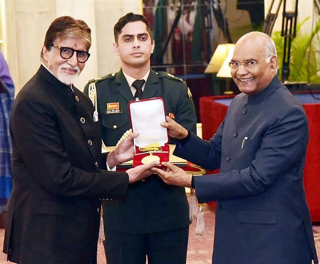 delhi. राष्ट्रपति रामनाथ कोविन्द ने राष्ट्रपति भवन में आयोजित एक समारोह में अमिताभ बच्चन को दादा साहेब फाल्के पुरस्कार प्रदान किया।