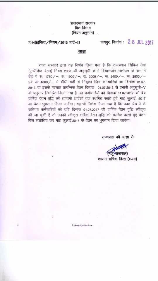 जयपुर। राज्य सरकार ने एक आदेश जारी कर उन कर्मचारियों को झटका दे दिया है जो वेतन बढऩे की आस लगाए बैठे थे। राज्य सरकार ने आज एक आदेश जारी किया जिसमें राजस्थान सिविल सेवा नियम 2008 की अनुसूचि-5 में संशोधन के क्रम में ग्रेड पे- रू 1700/-, रु 1900/-, रू 2000, रु 2400, रु. 2800 और रु. 4800 में सीधी भर्ती से 1-7-2013 या इसके पश्चात प्रारम्भिक वेतन दिनांक 1-7-2013 से प्रभावी अनुसूचि -5 के अनुसार निर्धारित किया गया है। उन कर्मचारियों को दिनांक 1-7-2017 को देय वार्षिक वेतन वृद्धि को आगामी आदेश तक स्थगीत रखते हुए। सरकार जुलाई 2017 का वेतन भुगतान किया जाएगा। और सरकार ने यह भी निर्णय लिया है कि उक्त ग्रेड पे के कर्मचारियों को यदि 1-7-2017 की वेतन वृद्धि स्वीकृत की जा चुकी है तो उनकी स्वीकृत वार्षिक वेतन वृद्धि को स्थगित करते हुए वेतन बिल संशोधित कर जुलाई माह के वेतन का भूगतान किया जाएगा।