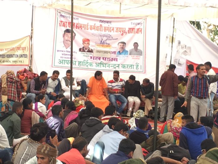 जयपुर। नियमित करने समेत विभिन्न मांगों को लेकर कई दिनों से राजस्थान विधानसभा के बाहर धरने पर बैठे सैकड़ों होमगार्ड्स ने मंगलवार को प्रदर्शन किया। इस दौरान कांग्रेस के पूर्व मंत्री गोपाल केसावत और राष्ट्रीय संत भजनाराम महाराज ने धरने पर मौजूद होमगार्ड्स को संबोधित किया। इन्होंने कहा कि राजस्थान में जनविरोधी सरकार है। उसे ना तो जनता की फ्रिक है और ना ही स्टेट। अपने हक और मांगों के लिए संघर्षरत करने वाले लोगों और संगठनों को दबाने के लिए यह सरकार लाठी-भाटा और गोली का सहारा लेती है। नौ दिन से होमगार्डस धरने पर बैठे हैं। लेकिन ना तो सरकार और ना ही गृहमंत्री उनकी मांगों पर ध्यान दे रहे हैं। उन्होंने हाल ही पुलिसकर्मियों द्वारा होमगार्ड्स पर किए गए लाठीचार्ज की निंदा की, साथ ही सरकार को चेताया भी अगर होमगार्डस की मांगे नहीं मानी गई तो आर-पार की लड़ाई में हम भी होमगार्डस के साथ हैं।धरने को होमगार्डस संगठन के अध्यक्ष झलकन सिंह राठौड, महासचिव आनन्द कुमार टोकसिया आदि ने संबोधित किया।