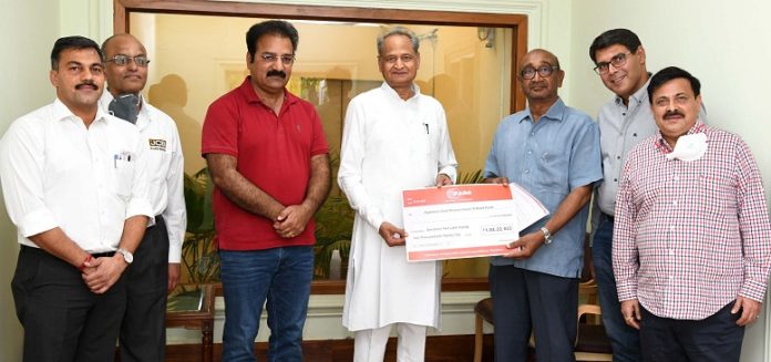 श्री अशोक गहलोत को फेडरेशन ऑफ ऑटोमोबाइल डीलर्स एसोसिएशन (फाडा) की ओर से 1 करोड़ 2 लाख 22 हजार 22 रूपये का चेक मंगलवार को भेंट किया गया। इस दौरान परिवहन मंत्री श्री प्रताप सिंह खाचरियावास, परिवहन आयुक्त श्री रवि जैन, केएस मोटर्स के श्री किशोर सिंह गहलोत सहित अन्य लोग उपस्थित थे। राजस्थान रॉयल्स ने भी राहत कोष में 25 लाख रूपए की सहायता दी है।