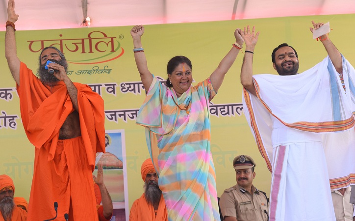 बांसवाड़ा. मुख्यमंत्री वसुन्धरा राजे ने कहा कि राजस्थान ने योग को अपनाकर स्वस्थ जीवन के रास्ते पर चलने का काम शुरू कर दिया है। पूरे प्रदेश में बड़ी संख्या में लोग योग करने लगे हैं। उन्होंने कहा कि योग देश-दुनिया में जिस तरीके से अब फैला है उसका श्रेय स्वामी रामदेव को जाता है। राजे गुरुवार को बासंवाड़ा में गोविंद गुरु जनजातीय विश्वविद्यालय के भवन के शिलान्यास के अवसर पर आयोजित कार्यक्रम में बोल रही थीं। इस दौरान उन्होंने पतंजलि योग पीठ द्वारा आयोजित निःशुल्क योग चिकित्सा एवं ध्यान शिविर में हिस्सा लिया। मुख्यमंत्री ने कहा कि योग जैसी स्वास्थ्य बढ़ाने वाली जिस परम्परा और प्रक्रिया को हम भूल गए थे, आज उसका लोहा पूरी दुनिया मानती है। उन्होंने कहा कि स्वामी रामदेव ने इसको दूर तक ले जाने का काम किया है।