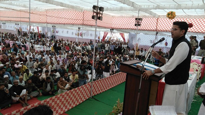 कोटा। राजस्थान प्रदेश कांग्रेस के अध्यक्ष सचिन पायलट ने कोटा में पीस मिशन ऑफ़ इंडिया राजस्थान के महाराव उम्मेद सिंह स्टेडियम में पैगामे अम्न कांफ्रेंस में मीडिया से मुखातिफ होते हुए कहा कि प्रदेश में भाजपा सरकार के कार्यकाल के तीन साल पुरे हो चुके है और इस मौके पे जो आँकड़े सरकार ने प्रस्तुत किये है और जो वादे किए है, सभी झूठ है। सच ये है कि राजस्थान आज भ्रष्टाचार का प्रदेश बन चूका है। समय समय पर एक मज़बूत विपक्ष की तरह कांग्रेस पार्टी भाजपा सरकार के घोटालों एवं झूठे वादों का पर्दाफाश करती आयी है एवं आगे भी करती रहेगी। देश में अम्नो शांति का पैग़ाम आम कर साम्प्रदायिक सोहार्द को मज़बूत बनाने के उद्देश्य से आयोजित इस कार्यक्रम में सचिन पायलट ने मुख्य अतिथि के रूप में शिरकत कर कार्यक्रम की शोभा बढ़ाई। सचिन पायलट ने कहा कि अलग अलग मंत्रालयों में करोड़ो के घोटालों के बाद भी हाल ही में जो मंत्रालय में फिर बदल किया गया है, वो महज़ जनता को गुमराह किया जा रहा है। मुख्यमंत्री को कठोर निर्णय लेना चाहिए था। आज राजस्थान में विकास एकदम ठप हो चूका है, लॉ एंड आर्डर बिलकुल चरमरा गया है। महिला मुख्यमंत्री होने के बावजूद महिलाओं पर अत्याचार एवं बलात्कार के मामले लगातार बढ़ रहे है।