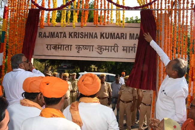 जयपुर। मुख्यमंत्री अशोक गहलोत ने सोमवार को जोधपुर जिले के सर्किट हाउस के सामने राजमाता कृष्णा कुमारी मार्ग का लोकार्पण किया। गहलोत राइका बाग पैलेस में महाराजा मानसिंह पुस्तक प्रकाश शोध केन्द्र मेहरानगढ़ म्यूजियम ट्रस्ट द्वारा आयोजित राजमाता कृष्णा कुमारी को समर्पित महाराजा हनुवन्त सिंह स्मृति व्याख्यानमाला में मुख्य अतिथि के रूप में शरीक हुए।
