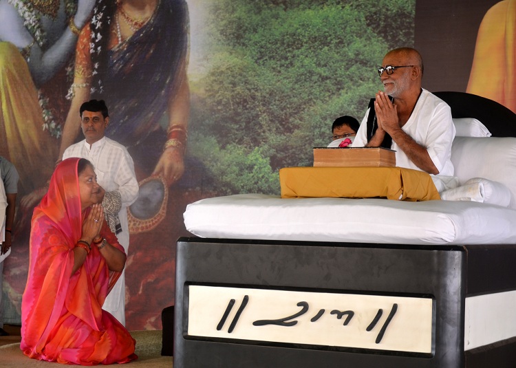 भरतपुर। मुख्यमंत्री वसुन्धरा राजे रविवार को भरतपुर जिले के कामां उपखण्ड मुख्यालय पर कोट ऊपर स्टेडियम में आयोजित संत मोरारी बापू के रामकथा कार्यक्रम में उपस्थित रहीं। मुख्यमंत्री राजे ने संत मोरारी बापू की रामकथा पोथी सिर पर रखकर आसन तक पहुंचाई तथा संत बापू की चरण वन्दना कर आर्शीवाद लिया। राजे के लिये रामकथा पांडाल में बैठने के लिये विशेष व्यवस्था की गई थी, लेकिन वे साधारण पंक्ति में जाकर आम श्रद्धालुओं के साथ जमीन पर ही बैठीं तथा वहीं बैठकर आध्यात्मिक रामकथा सुनी।