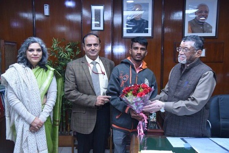 delhi. केन्द्रीय श्रम और रोजगार राज्य मंत्री संतोष कुमार गंगवार ने आज फूड डिलीवरी बॉय सिद्धरामेश्वर सिद्धराम हुमनावडे को एक लाख रुपये का पुरस्कार देकर सम्मानित किया। इस फूड डिलीवरी बॉय ने 17 दिसंबर, 2018 को ईएसआईसी अस्पताल, अंधेरी, मुंबई में आग लगने की दुखद घटना के दौरान 10 लोगों की जान बचाने में मदद की थी।