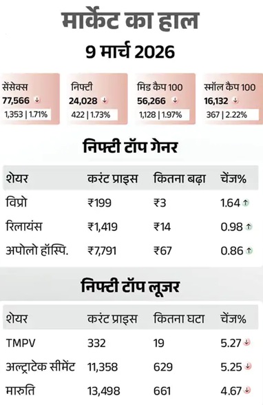 मुंबई. अमेरिका-इजराइल और ईरान के कारण शेयर बाजार में आज यानी 9 मार्च को बड़ी गिरावट रही। सेंसेक्स 1353 अंक (1.71%) नीचे 77,566 के स्तर पर बंद हुआ। वहीं निफ्टी में भी 422 अंक (1.73%) की गिरावट रही, ये 24,028 पर बंद हुआ। आज बैंक, ऑटो, मेटल, एनर्जी और एफएमसीजी शेयरों में ज्यादा बिकवाली रही। जियोपॉलिटिकल तनाव और जंग जैसी स्थिति में महंगाई बढ़ने का खतरा रहता है। इससे कंपनियों का मुनाफा कम हो सकता है। ऐसे में निवेशक अपने शेयर बेचना शुरू कर देते हैं और सुरक्षित जगह निवेश करते हैं। इससे बाजार में गिरावट आती है। ईरान-इजराइल युद्ध से सप्लाई चेन बिगड़ने का डर। कच्चे तेल के दाम बढ़ने से भारत का इंपोर्ट बिल और महंगाई बढ़ेगी। अमेरिका और एशियाई बाजारों में गिरावट का असर भारत पर। ईरान और इजरायल-अमेरिका के बीच छिड़ी जंग से निवेशकों की वेल्थ 22 लाख करोड़ रुपए से ज्यादा घट गई है। जंग शुरू होने से पहले यानी 27 फरवरी को बॉम्बे स्टॉक एक्सचेंज पर लिस्टेड सभी कंपनियों का कुल मार्केट कैप ₹4.63 लाख करोड़ था। लेकिन युद्ध की वजह से बाजार में भारी बिकवाली के कारण 9 मार्च तक यह घटकर ₹4.41 लाख करोड़ पर आ गया है। अंतरराष्ट्रीय बाजार में कच्चे तेल के दाम साढ़े तीन साल के हाई पर पहुंच गए। आज यानी 9 मार्च को कारोबार के दौरान ये 25% बढ़कर 115 डॉलर प्रति बैरल के पार पहुंच गया। हालांकि बाद में ये थोड़ा नीचे आया और ये अब 105 डॉलर के करीब है। 10 दिन में ये करीब 50% चढ़ा है। इससे पहले 2022 में रूस-यूक्रेन जंग से कच्चा तेल 100 डॉलर के पार निकला था। जानकारों का मानना है कि तेल की कीमतें 150 डॉलर प्रति बैरल तक पहुंच सकती हैं। इसका असर भारत में पेट्रोल-डीजल पर दिख सकता है। ये 5 से 6 रुपए लीटर तक महंगा हो सकता है। हालांकि भारत सरकार का कहना है कि हमारे पास पर्याप्त तेल है।