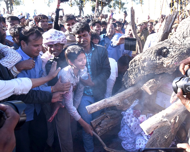 जयपुर। पुलवामा में केन्द्रीय रिजर्व पुलिस बल पर हुए आतंकी हमले में शहीद हुए राजसमन्द पंचायत समिति के बिनोल ग्राम निवासी हेड कॉन्स्टेबल नारायणलाल गुर्जर को शनिवार को अंतिम विदाई देने राजसमन्द जिले भर कई गांवों के गमगीन लोगों का जनसैलाब उमड़ पड़ा। वहीं मेवाड़ व राजस्थान के अन्य हिस्सों से भी शहीद को श्रद्धांजलि देने लोग पहुंचे।