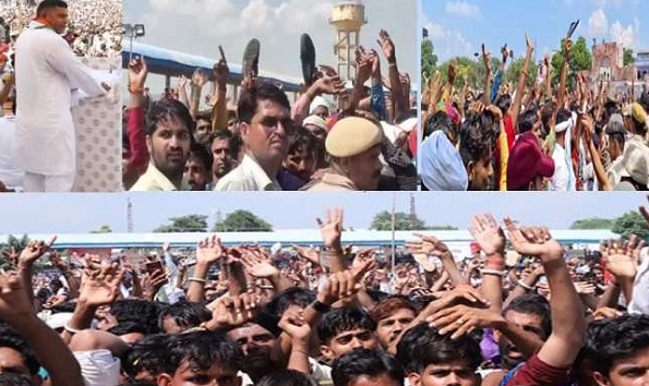 सचिन पायलट जिंदाबाद के नारे शुरुआत से ही लगने शुरू हो गए थे। उद्योग मंत्री शकुन्तला रावत भाषण देने आईं तो विरोध शुरू हो गया। उन्होंने करौली में कर्नल बैंसला के नाम पर कॉलेज खोलने की घोषणा की। समर्थकों ने उनको भाषण नहीं देने दिया। पायलट जिंदाबाद के नारे लगाए। फिर भी रावत ने भाषण दिया। इसके बाद खेल राज्य मंत्री अशोक चांदना भाषण देने के लिए आए। समर्थकों को यह मंजूर नहीं था। उन्होंने जूते व अन्य सामान फेंक कर हंगामा खड़ा कर दिया। फिर से पायलट जिंदाबाद के नारे लगाने लगे। पुलिस व अन्य लोगों ने समर्थकों को शांत किया। चांदना को भाषण बीच में ही छोड़ना पड़ा।
