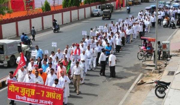 अजमेर । सिन्धी समाज अजमेर के सामाजिक पंचायतों, धार्मिक और व्यापारिक संगठनों द्वारा संतो के सानिध्य में मौन जुलूस स्वामी कॉम्पलेक्स से कलेक्ट्रेट कार्यालय तक निकालकर जिला कलेक्टर के माध्यम से महामहीम राष्ट्रपति, माननीय प्रधानमंत्री, भारत सरकार व माननीय मुख्यमंत्री छतीसगढ के नाम दुर्ग छतीसगढ में हुई सिन्धी युवकों के साथ अमानवीय घटना और एक समाचार पत्र में प्रकाशित समाचार के विरोध में दिया गया। इस अवसर पर अखिल भारतीय सिन्धी साधू समाज के राष्ट्रीय महामंत्री व बालकधाम किशनगढ के महंत श्यामदास उदासीन ने कहा कि सिन्धी समाज पाकिस्तानी होने का अपशब्द कतई बर्दास्त नहीं करेगा।