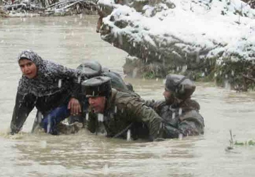 नई दिल्ली। अप्रेल के महीने में जहां उत्तर भारत के मैदानी इलाकों में सूर्य देव अपने तेवर दिखा रहे हैं। वहीं देश की जन्नत कहे जाने वाले जम्मू कश्मीर में इंद्र देव पूरी तरह मेहरबान बने हुए हैं। जम्मू कश्मीर में पिछले 24 घंटे में जोरदार बारिश होने से मैदानी इलाकों में जलभराव हो गया। पानी का भराव होने से यहां बाढ़ जैसे हालात पैदा हो गए हैं। वहीं सेना लोगों की मदद में जुटी गई है। यहां पिछले तीन दिनों से बेमौसम में बर्फबारी के साथ लगातार बारिश होने के कारण लोगों को खासी परेशानी का सामना करना पड़ रहा है। ऐसे में प्रशासन ने सुरक्षा के मद्देनजर घाटी में सभी स्कूल सोमवार तक के लिए बंद कर दिए। इधर सेना आपदा की स्थिति में एक बार फिर कश्मीर वासियों के लिए देवदूत बनकर सामने आई। सेना के जवानों ने बरसात में फंसें लोगों को सुरक्षित स्थानों पर पहुंचाया।