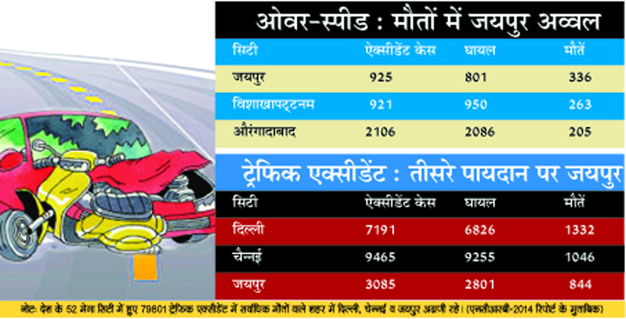 जयपुर। तेज रफ्तार से चलते वाहन लोगों के जीवन के साथ खेल रहे हैं। चाहे वह चौपहिया हो या दुपहिया। स्पीड ने लोगों का जीवन लीलने लगा है। मुम्बई में अभिनेता सलमान खान का मसला हो या जयपुर में विधायक नंदकिशोर महरिया के बेटे से जुड़ा हिट एण्ड रन का मामला हो। इनमें तेज रफ्तार से वाहन चलाते हुए राहगीरों व दूसरे वाहनों को कुचला गया है। देश में ये एक या दो ही नहीं, ऐसे हजारों मामले हैं, जिसमें तेज रफ्तार से चौपहिया व दुपहिया वाहन चलाते हुए लोगों को कुचल दिया गया। अधिकांश मामलों में यह भी सामने आया है कि हादसे के दौरान चालक शराब व दूसरे नशे में धुत्त दिखे। जयपुर के बीएमडब्ल्यू हादसे में चालक विधायक पुत्र सिद्धार्थ नशे में मिला। उसकी कार की रफ्तार सवा सौ किलोमीटर प्रतिघंटा के हिसाब से दौड़ते हुए ऑटोरिक्शा को टक्कर मारी, जिसमें तीन की मौत हुई और सड़क पर खड़ी पुलिस पीसीआर वैन के पुलिसकर्मी भी घायल हो गए। वर्ष 2014 में पूरे राजस्थान में तेज रफ्तार वाहनों के हादसों में करीब 35सौ से अधिक मौतें हुई और देश भर में 48 हजार लोग काल के ग्रास बने। ओवर-स्पीड हादसों में राजस्थान का पूरे देश में छठा नम्बर रहा, जबकि मेगासिटी में ओवर स्पीड हादसों में जयपुर देशभर में अव्वल रहा है। इन हादसों में जयपुर में 336 की मौतें हुई, जो देश की प्रमुख 52 मेगा सिटी में सर्वाधिक रही। जयपुर के बाद विशाखापट्टनम में 268 और औरंगाबाद में 205 मौतें ओवर स्पीड वाहनों के हादसों से हुई है। नेशनल क्राइम रिकॉर्ड ब्यूरो के मुताबिक जयपुर सिटी पूरे देश में ओवर-स्पीड मामले में खतरनाक स्थिति पर है। दिल्ली, चेन्नई, मुम्बई, कोलकाता, बंगलुरु जैसे बड़े मेगासिटी भी ओवर-स्पीड हादसों में जयपुर से काफी कम है, जबकि इन शहरों की जनसंख्या जयपुर से तीन से पांच गुणा है और तेज रफ्तार वाहनों की तादाद भी कई गुणा है, लेकिन कानून में खामियां और सख्ती नहीं होने के कारण हादसों पर अकुंश नहीं है। शराब पीकर वाहन चलाना और दुर्घटना आम बात हो गई है। पुलिस भी सिर्फ अभियान चलाकर या सड़क सुरक्षा सप्ताह मनाकर अपने कार्यों की इतिश्री कर लेती है। अगर पुलिस और सरकार सख्ती बरती तो ना केवल ऐसे हादसों पर रोक लग सकती है, बल्कि सुरक्षित शहर के तौर पर जयपुर की पहचान बन सकती है। अगर ऐसे ही हादसे होते रहे तो पिंकसिटी और टूरिज्म सिटी के नाम से पहचाने जाने वाला जयपुर एक्सीडेंटल सिटी के तौर पर भी ख्यात होने से बच नहीं पाएगा। इसी तरह लापरवाही व खतरनाक तरीके से वाहन चलाने से हुए हादसों में भी देश में 41 हजार से अधिक मौतें हुई, जिसमें 3417 मौतें तो राजस्थान में हुई। वहीं शराब पीकर वाहन चलाने से 71 लोगों की जानें चली गई, जबकि देश में यह आंकडा 2558 का रहा। जयपुर में लापरवाही से वाहन चलाने के करीब छह सौ मामले दर्ज हुए