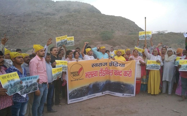 दिल्ली. स्वराज इंडिया ने दिल्ली के भलस्वा लैंडफिल साईट को बंद करने की माँग के साथ रविवार को विरोध प्रदर्शन किया। इसके तहत प्रदर्शनकारियों ने साईट पर जाकर एक मानव श्रृंखला भी बनाई। स्वराज इंडिया के सैकड़ों कार्यकर्ताओं के साथ भलस्वा और बादली गाँव के स्थानीय निवासी भी प्रदर्शन में शामिल हुए।