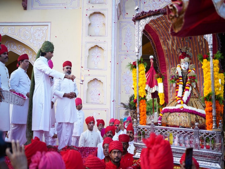 जयपुर. सिटी पैलेस से तीज माता की शाही सवारी निकाली। तीज माता को सोने की ज्वेलरी से सजाकर चांदी के रथ में नगर भ्रमण कराया । तीज की शाही सवारी में शामिल होने के लिए स्थानीय लोगों के साथ बड़ी संख्या में देसी-विदेशी पर्यटक भी परकोटे में पहुंचे। तीज माता की शाही सवारी के जनानी ड्योढ़ी से निकलते ही त्रिपोलिया गेट पर पूर्व राजपरिवार के सदस्य पद्मनाभ सिंह ने दर्शन किए और आरती की। इसके साथ ही जयपुर बसने से चली आ रही 296 साल की परंपरा बदल गई। पूर्व राजपरिवार के सदस्य अब तक जनानी ड्योढ़ी से निकलने वाली तीज की सवारी के दर्शन और आरती चीनी की बुर्ज से करते थे। परंपरा बदलने का कारण चीनी की बुर्ज पर अब ज्यादा भीड़भाड़ होना बताया जा रहा है। इसी साल गणगौर की सवारी के भी उन्होंने त्रिपोलिया गेट से ही दर्शन किए थे। बैंड बाजा, सजे हुए ऊंट-घोड़े और शाही लवाजमे के साथ तीज माता चांदी की पालकी पर सवार होकर त्रिपोलिया गेट से रवाना हुईं, जो छोटी चौपड़, गणगौरी बाजार होते हुए तालकटोरा पहुंचेंगी। इस तीज फेस्टिवल कार्यक्रम के दौरान प्रदेश की अलग-अलग जगहों से आए 150 से ज्यादा कलाकार प्रदेश की लोक कला और संस्कृति की छटा बिखेर रहे हैं। राजस्थान के प्रसिद्ध कालबेलिया, गैर नृत्य, बहरूपिया, मशक वादन, कठपुतली नृत्य, कच्छी घोड़ी और अलग-अलग बैंड ग्रुप व अनेक लोक कलाकारों के समूह तीज की शाही सवारी में शामिल होकर प्रस्तुतियां दे रहे हैं। पर्यटन विभाग की तरफ से विदेशी मेहमानों के लिए त्रिपोलिया गेट के सामने हिंद होटल की छत पर बैठने की व्यवस्था की गई। महाराजा सवाई जय सिंह द्वितीय ने 1727 में तीज की सवारी भव्य लवाजमे के साथ निकालना शुरू किया था। तीज माता की भव्य मूर्ति यानी देवी पार्वती स्थायी रूप से सिटी पैलेस में ही रहती हैं। साल में 2 दिन तीज माता की सवारी निकलती है। सावन के शुक्ल पक्ष की तृतीया में तीज माता कहा जाता है और सावन शुल्क पक्ष चतुर्थी को उन्हें ‘बूढ़ी’ (पुरानी या वरिष्ठ) तीज माता माना जाता है। चांदी की पालकी में तीज माता विराजमान होती है, उसका वजन करीब 400 किलो है।