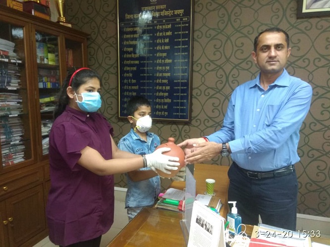 जयपुर, 24 मार्च। कोरोना आपदा के दौरान वंचित एवं कमजोर वर्गों की मदद के लिए कई लोग एवं संगठन रोजाना सामने आ रहे हैं। मंगलवार को जयपुर में हाथी बाबू बाग निवासी तृप्ता (12) और चिराग पुरोहित (10) अपनी महीनों से इकट्ठा कर रही जेबखर्च और बचत की राशि गुल्लक में लेकर जिला कलक्टर को कोराना पीड़ितों की मदद के लिए देने पहुंचे। जिला कलक्टर डॉ.जोगाराम ने उनके जज्बे की प्रशंसा करते हुए इस राशि को चैक में बदलने के लिए बच्चों के साथ आए दादा को साैंप दिया ताकि इसे कोरोना की व्यवस्थाओं के लिए काम में लिया जाए।