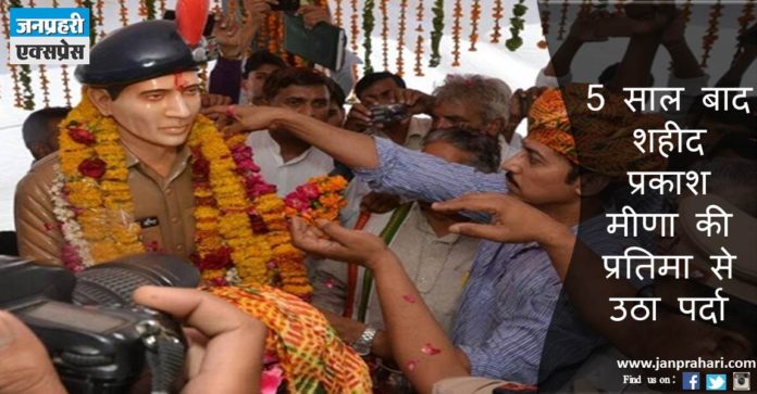 जयपुर। 5 साल के लंबे इंतजार के बाद आखिरकार जमवारामगढ़ के जयसिंहपुरा निवासी शहीद प्रकाशचंद मीणा की प्रतिमा से पर्दा उठ ही गया। शहीद प्रकाश मीणा की प्रतिमा के अनावरण को लेकर 4 साल के अंतराल में न तो वर्तमान सीएम वसुंधरा राजे ही समय निकाल पाई न ही पूर्व सीएम अशोक गहलोत। शनिवार को केन्द्रीय सूचना एवं प्रसारण मंत्री व स्थानीय सांसद कर्नल राज्यवर्धन सिंह राठौड़ ने जयसिंहपुरा पहुंचकर शहीद प्रकाश की प्रतिमा का अनावरण किया। पर्दे में ढकी प्रकाश की प्रतिमा जैसे ही पर्दे से बाहर आई तो समीप ही खड़े पिता श्रीकृष्ण मीणा व उसकी मां भगवती की आंखें भर आई। यहां उपस्थित ग्रामीणों ने शहीद प्रकाश व भारत माता के जयकारें लगाए। इस मौके पर सांसद कर्नल राठौड़ ने कहा कि देश आज ऐसे युवाओं के दम पर ही सुरक्षित है। प्रकाश ने कम आयु में ही पैरामिलिट्री फोर्स ज्वाइन की और अपने प्राणों का बलिदान दे दिया। प्रकाश ने देश के युवाओं के सामने देश प्रेम की एक अनूठी मिसाल पेश की है। कर्नल राठौड़ ने शहीद प्रकाश के नाम से 15 लाख रुपए की लागत से सामुदायिक भवन के निर्माण की घोषणा की। इस मौके पर विधायक जगदीश मीणा, सीआरपीएफ से सेवानिवृत्त डिप्टी कमांडेट व ग्राम पंचायत सामरेडकलां सरंपच सीताराम छापोला, भूदान बोर्ड अध्यक्ष रामनारायण नागवा, भाजपा नेता जगदीश नौनपुरा सहित बड़ी संख्या में ग्रामवासी उपस्थित थे।