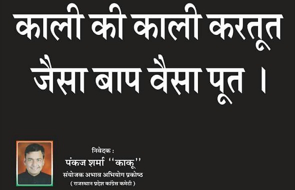 इससे ज्यादा चर्चा केबिनेट मंत्री के क्षेत्र में लगे कुछ पोस्टर्स और बैनर की हो रही है, जिसमें पैसों के लेन-देन में फंसे बेटे के साथ मंत्री पिता को भी लपेटते हुए पूरे क्षेत्र में सैकड़ों पोस्टर्स लगा दिए गए हैं। ये पोस्टर और होर्डिंग्स कांग्रेस अभाव अभियोग प्रकोष्ठ के प्रदेश अध्यक्ष व जयपुर कांग्रेस के दबंग छवि के पंकज शर्मा काकू ने मंत्री के विधानसभा क्षेत्र मालवीय नगर में लगाए हैं। काली की काली करतूत, जैसा बाप वैसा पूत के नारों के साथ ये होर्डिंग्स बैनर लगाए गए हैं। इनकी जयपुर शहर में चर्चा हो रही है। पंकज शर्मा ने कहा कि जब तक मंत्री को नहीं हटाया जाएगा और विधायक पद से इस्तीफा नहीं दिया जाएगा तब तक अभाव अभियोग प्रकोष्ठ आंदोलन चलाएगा। पांच फरवरी से शुरु  राजस्थान विधानसभा पर भी प्रदर्शन किया जाएगा। पंकज शर्मा ने आरोप लगाया कि मंत्री पुत्र की सीडी सामने आने पर भी मुख्यमंत्री वसुंधरा राजे कोई कदम नहीं उठा रही है, जिससे जाहिर है कि सरकार भी भ्रष्टाचार में लिप्त मंत्री व उनके बेटे पर कार्रवाई नहीं करना चाहती है। कांग्रेस जब तक मंत्री व पुत्र पर कार्रवाई नहीं हो जाती, तब तक आंदोलन करेगी और ऐसे भ्रष्ट मंत्री की कारगुजारियां जनता में उजागर करती रहेगी। गौरतलब है कि पूर्व मुख्यमंत्री अशोक गहलोत भी मंत्री व मंत्री पुत्र पर तंज कसते हुए कह चुके हैं कि मंत्री के पेट्रोल पम्प से तबादलों का गोरखधंधा चलता है।