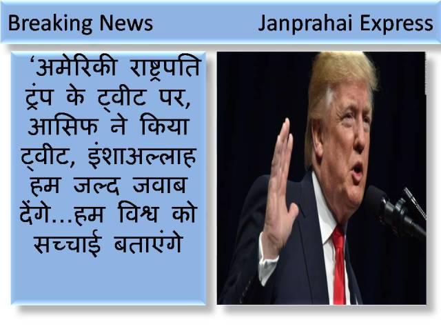 आसिफ ने ट्वीट किया, ‘‘हम अमेरिकी राष्ट्रपति ट्रंप के ट्वीट पर इंशाअल्लाह जल्द जवाब देंगे…हम विश्व को सच्चाई बताएंगे….तथ्यों और गढ़ी कहानी का अंतर बताएंगे।’’ गत नवम्बर में अमेरिका ने पाकिस्तान द्वारा मुम्बई आतंकवादी हमले के मुख्य षड्यंत्रकर्ता हाफिज सईद की रिहायी की कड़ी निंदा की थी और उसे तत्काल फिर से गिरफ्तार करने और उसके खिलाफ मामला चलाने की मांग की थी। अमेरिका ने चेतावनी दी थी कि यदि पाकिस्तान जमात उद दावा प्रमुख हाफिज सईद के खिलाफ कोई ‘‘निर्णायक कार्रवाई’’ करने में असफल रहा तो उसके द्विपक्षीय संबंधों पर ‘‘प्रभाव’’ होंगे।