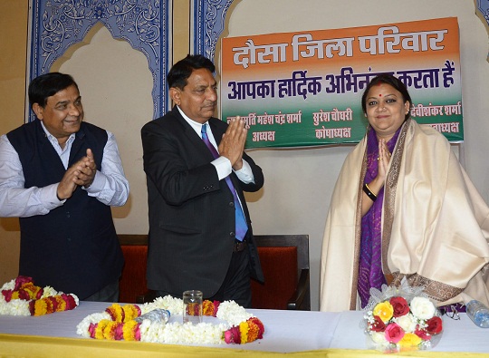 दौसा जिला परिवार के अध्यक्ष जस्टिस महेश शर्मा ने कहा कि दौसा वालों के लिए एक कहावत है कि दौसा के दो और गांव के सौ बराबर है। उन्होंने ने इस संस्था के गठन की जानकारी देते हुए भविष्य में संस्था के विस्तार की बात कही। परिवार के कार्यकारी अध्यक्ष पंडित पुरुषोत्तम गौड़ ने बताया कि इस अवसर पर महिला व बाल विकास मंत्री ममता भूपेश, विधायक जीआर खटाना का साफा, शाल और डिग्गी कल्याण भगवान का चित्र देकर सम्मान किया गया। साथ ही दौसा जिले के जेपी शर्मा, योगेश शर्मा, नरेन्द्र शर्मा, डॉ. एसडी शर्मा समेत दौसावासियों का सम्मान भी किया गया। कार्यक्रम का संचालन अजय नागर ने किया। दौसा जिला परिवार के कार्यकारी अध्यक्ष पं. पुरषोतम गौड़ ने धन्यवाद ज्ञापित किया।
