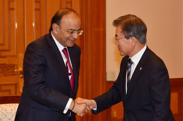 कोरिया मे जेटली का स्वागत करते हुए राष्ट्रपति मून ने प्रधानमंत्री नरेन्द्र मोदी का चुनाव में विजय प्राप्त करने के लिए उनकी शुभकामनाओं के लिए धन्यवाद व्यक्त किया। मून ने विशेष तौर पर ट्विटर में कोरियाई भाषा मे संदेश देने के लिए प्रधानमंत्री मोदी का स्मरण किया। 11 मई को प्रधानमंत्री मोदी द्वारा बधाई संदेश देने के लिए किये फोन का स्मरण करते हुए मून ने कहा कि दोनो पक्षों में द्विपक्षीय भागीदारी के निर्माण के लिए प्रबल इच्छा शक्ति है।वित्तमंत्री अरूण जेटली ने प्रधानमंत्री नरेन्द्र मोदी द्वारा इस निर्णय की सराहना के संदेश के बारे में बताए हुए कहा कि इस प्रकार की शुरूआत भारत के पूर्व की ओर देखो नीति के अनुरूप है। उन्होंने इस बात पर जोर दिया कि अंतरार्राष्ट्रीय संबंधो में उद्यत कोरिया एशिया और अन्य देशों के लिए लाभदायक है। वित्तमंत्री ने राष्ट्रपति मून को हितकारी बैठकों के संबंध में जानकारी दी। श्री जेटली ने दोनो देशों के बीच रक्षा उद्योगएआधारभूत ढांचे में निवेश और उत्पादन में भागीदारी के लिए दोनों देशों विशाल अवसरो के बारे में बताया। राष्ट्रपति मून ने प्रधानमंत्री श्री नरेन्द्र मोदी और वित्तमंत्री श्री जेटली के नेतृत्व में ऐतिहासिक आर्थिक सुधारों की सराहना कि और कहा की उन्हें विश्वास है कि भारत शीघ्र ही विशाल आर्थिक शक्ति बनने के पथ पर अग्रसर है।उन्होंने कोरिया में भारत के उच्च कुशल योग्य पेशेवर की सराहना की।
