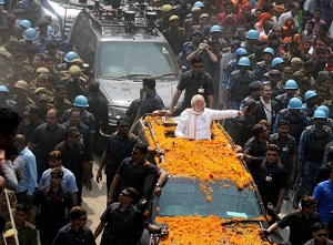 वाराणसी। यूपी चुनाव के अंतिम चरण में मतदाताओं को रिझाने के मामले में सभी प्रमुख दलों ने शनिवार को अपनी पूरी ताकत झौंक दी। वाराणसी में एक ही दिन में पीएम मोदी सहित अखिलेश-राहुल गांधी के साथ बसपा सुप्रीमो मायावती की रैली का आयोजन होना है। इधर यूपी में भाजपा की जीत सुनिश्चित करने के लिए प्रधानमंत्री नरेन्द्र मोदी खुद रोड शो के रुप में मतदाताओं के बीच पहुंचे। शहर के बनारस हिंदू यूनिवर्सिटी से शुरू हुआ उनका रोड शो काशी विश्वनाथ मंदिर पर पहुंचा। जहां पीएम मोदी ने भगवान विश्वनाथ की पूजा-अर्चना की। इस दौरान मार्ग में जगह-जगह पुष्प वर्षा कर पीएम मोदी का स्वागत किया गया। प्रधानमंत्री के रोड शो के दौरान अपार जनसमूह देखने को मिला। इससे पहले पीएम सुबह बाबतपुर एयरपोर्ट से सीधे यूनिवर्सिटी पहुंचे। जहां पर उन्होंने महामना पं. मदन मोहन मालवीया की प्रतिमा पर माल्यार्पण किया। इसके बाद वे रोड शो में शामिल हुए। पीएम मोदी के रोड शो के मद्देनजर काफिले के मार्ग पर सुरक्षा व्यवस्था को पूरी तरह चाकचौबंद किया गया। रोड शो के कार्यक्रम को देखते हुए भाजपा के कई वरिष्ठ नेता पहले से ही बनारस में डेरा डाले हुए हैं। रोड शो के बाद पीएम मोदी जौनपुर चले गए। जहां चुनावी सभा के बाद बनारस लौटेंगे और टाउनहॉल में सभा को संबोधित करेंगे। इधर कांग्रेस पार्टी ने पीएम मोदी के इस कार्यक्रम की आलोचना करते हुए कहा कि पीएम के इस कार्यक्रम की अनुमति नहीं ली गई।