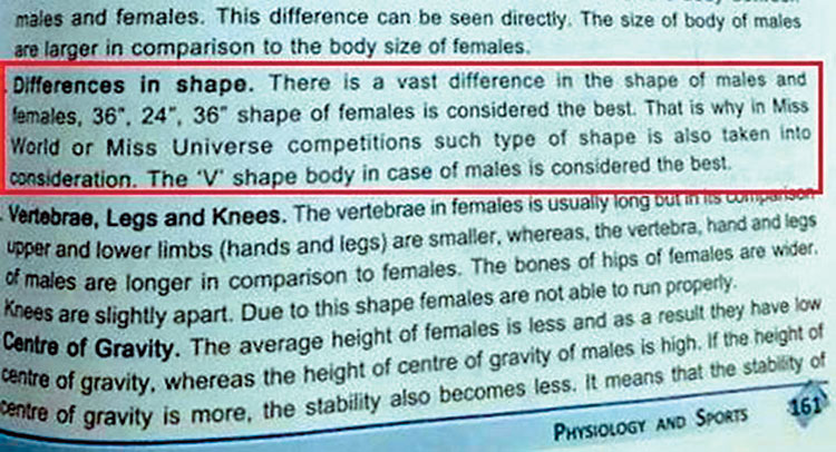 नई दिल्ली। सीबीएसई के पाठ्यक्रमों को लेकर विवादित विषय आते ही रहते हैं। अब सीबीएसई के पाठ्यक्रम को लेकर एक नया विवाद सामने आया है। पाठ्यक्रम में महिलाओं को लेकर एक विषय पर सोशल मीडिया पर खूब छीछलेदारी हो रही है। इस विषय में लड़कियों के बेस्ट फीगर और शरीर के अच्छे आकार के बारे में छात्रों को पढ़ाया जा रहा है। इसे लेकर छात्रों के साथ बड़ों में भी खासी उत्सुकता मची हुई है, साथ ही इसे सोशल मीडिया में भी वायरल कर रहे हैं। न्यू सरस्वती हाउस की प्रकाशित पाठ्यपुस्तक में फिजिकल एजुकेशन के बारे में जानकारी है। इसे 12वीं क्लास में पढ़ाया जा रहा है। इस पुस्तक का शीर्षक है द हेल्थ एंड फि जिकल एजुकेशन, इसमें बताया है कि व्यायाम फि गर को आकर्षक बनाता है। साथ ही यह भी कहा है कि उन महिलाओं का फिगर सबसे सही माना जाता है, जिनका फिगर 36, 24, 36 का होगा। ये परफेक्ट फिगर कहलाता है। इसे साबित करने के लिए मिस वल्र्ड व मिस यूनिवर्स प्रतियोगिता का हवाला भी दिया गया है। इस पुस्तक में ये भी कहा गया है कि व्यायाम फिगर को आकषज़्क बनाता है। यह सामग्री सोशल मीडिया पर खूब वायरल हो रही है।