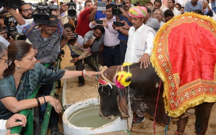 जयपुर। मुख्यमंत्री वसुन्धरा राजे ने कहा कि हिंगोनिया गौ पुनर्वास केन्द्र को राज्य सरकार देश में गौ सेवा के एक आदर्श केन्द्र के रूप में विकसित करेगी। उन्होंने इसके लिए शनिवार को गोपाष्टमी पर जयपुर नगर निगम को दस करोड़ रूपए का विशेष अनुदान देने की घोषणा की। मुख्यमंत्री ने इस पावन अवसर पर हिंगोनिया गौ पुनर्वास केन्द्र में गौवंश की पूजा की तथा गायों को गुड़ एवं चारा खिलाकर आमजन को गौसेवा का पावन संदेश दिया। यहां गौपूजन एवं अन्नकूट प्रसादी कार्यक्रम में मुख्यमंत्री ने कहा कि गौ सेवा हमारी धार्मिक भावना और आस्था से जुड़ा ऐसा विषय है जो मात्र सरकार ही नहीं, हम सबकी जिम्मेदारी है। उन्होंने कहा कि गौवंश के संरक्षण एवं संवर्धन के लिए हम सभी को सामूहिक प्रयास करने हांेंगे। राज्य सरकार इस दिशा में समर्पित भाव से काम कर रही है।