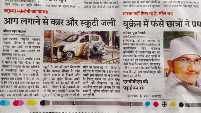 पत्र में बताया है कि महिला पत्रकार झालावाड़ के झालरापाटन की रहने वाली गीता मीना है, जो दैनिक समाचार पत्र राष्ट्र का वाचन की झालावाड ब्यूरो चीफ है। गीता मीना के घर पर 25 मार्च को शराब माफिया से जुड़े लोगों ने आग लगा दी थी, जिसमें उनकी चौपहिया कार, दुपहिया वाहन जल गए थे। समय रहते आग का पता लगने पर वह और उनके परिजन बमुश्किल घर से निकले। घटना के दिन ही झालरापाटन पुलिस थाने में नामजद आरोपियों के खिलाफ मामला दर्ज करवा दिया था, लेकिन पुलिस ने अभी तक सिर्फ एक ही आरोपी को पकड़ा है। दूसरे आरोपी अभी भी खुलेआम घूम रहे हैं। गिरफ्तारी नहीं होने से गीता मीना व परिजनों को अदेशा है कि वे फिर से हमला कर सकते हैं। गौरतलब है कि गीता मीना ने उनकी कॉलोनी में अवैध शराब में लिप्त शराब माफिया के खिलाफ समाचार प्रकाशित किए और इसकी शिकायत पुलिस थाने में की थी। इस वजह से शराब माफिया के लोगों ने उनके घर में आग लगा दी। जर्नलिस्ट्स एसोसिएशन आॅफ राजस्थान (जार) के प्रदेश अध्यक्ष राकेश कुमार शर्मा ने महिला पत्रकार के घर में हुई आगजनी और धमकी के मामले की निष्पक्ष जांच करवाकर नामजद आरोपियों की गिरफ्तारी और पत्रकार को सुरक्षा उपलब्ध करवाने की मांग की है।