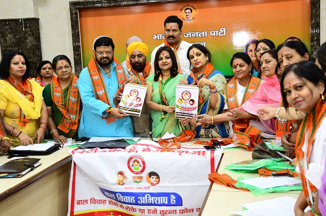 जयपुर। भाजपा बेटी बचाओ-बेटी पढ़ाओ प्रकल्प की बैठक भाजपा प्रदेश कार्यालय जयपुर में प्रकल्प प्रमुख डाॅ. मीना आसोपा की अध्यक्षता में आयोजित की गई। बेटी बचाओ-बेटी पढ़ाओ प्रकल्प प्रमुख डाॅ. मीना आसोपा ने बताया कि भाजपा के प्रदेश कार्यालय प्रभारी मुकेश चेलावत जी द्वारा भारत माता, पं. दीनदयाल उपाध्याय, डाॅ. श्यामा प्रसाद मुखर्जी के चित्र पर माल्यार्पण कर दीप प्रज्वलन किया गया एवं राष्ट्रीय गीत जयपुर सम्भाग की सह-प्रभारी सुमन भटनागर के द्वारा गाया गया। डाॅ. मीना आसोपा ने बताया कि बेटी बचाओ-बेटी पढ़ाओ की प्रदेश स्तरीय बैठक से सम्बन्धित पोस्टर, पतंग एवं बाल विवाह एक अभिशाप के बैनर का विमोचन भाजपा प्रदेशाध्यक्ष अशोक परनामी जी द्वारा किया गया। इस बैठक का मुख्य आयोजन आखा तीज पर होने वाले बाल विवाह की रोकथाम करने हेतु किया गया।